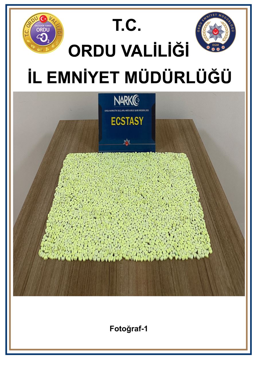 Ordu'nun Altınordu İlçesinde durumundan şüphelenilen 1 şahsa yönelik yapılan aramada; 3000 adet Ecstasy hap ele geçirildi. Gözaltına alınan Mehmet Serdar S. tutuklandı.