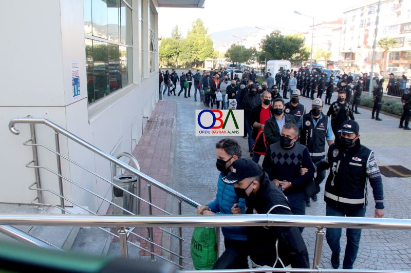 Ordu Cumhuriyet Başsavcılığı'nca FETÖ/PDY'nin 'yeni il yapılanması'na yönelik soruşturma kapsamında 4 gün önce operasyon düzenlendi. Yaklaşık 6 ay süren iletişimin dinlenmesi, teknik araçlarla izleme ve fiziki takip sonucu 16'sı KHK ile ihraç edilen kamu görevlisi olmak üzere 44 şüpheli gözaltına alındı. 'Yeni yapılanma'da 'mütevelli üyesi' olarak tanımlananlar dahil 10 şüpheli, Gülyalı ilçesindeki bir restoranda toplantı sırasında aralarında topladıkları paralarla suçüstü yakalanmıştı. Şüphelilerin ev ve iş yerlerinde yapılan aramalarda; örgüte ait olduğu değerlendirilen 370 bin lira, 100 bin 665 dolar, 17 bin 150 euro, 1,5 kilogram altın ile 1 ruhsatsız silah, 11 mermi, şüphelilere ait dijital materyaller ve çok sayıda örgütsel doküman ele geçirildi.