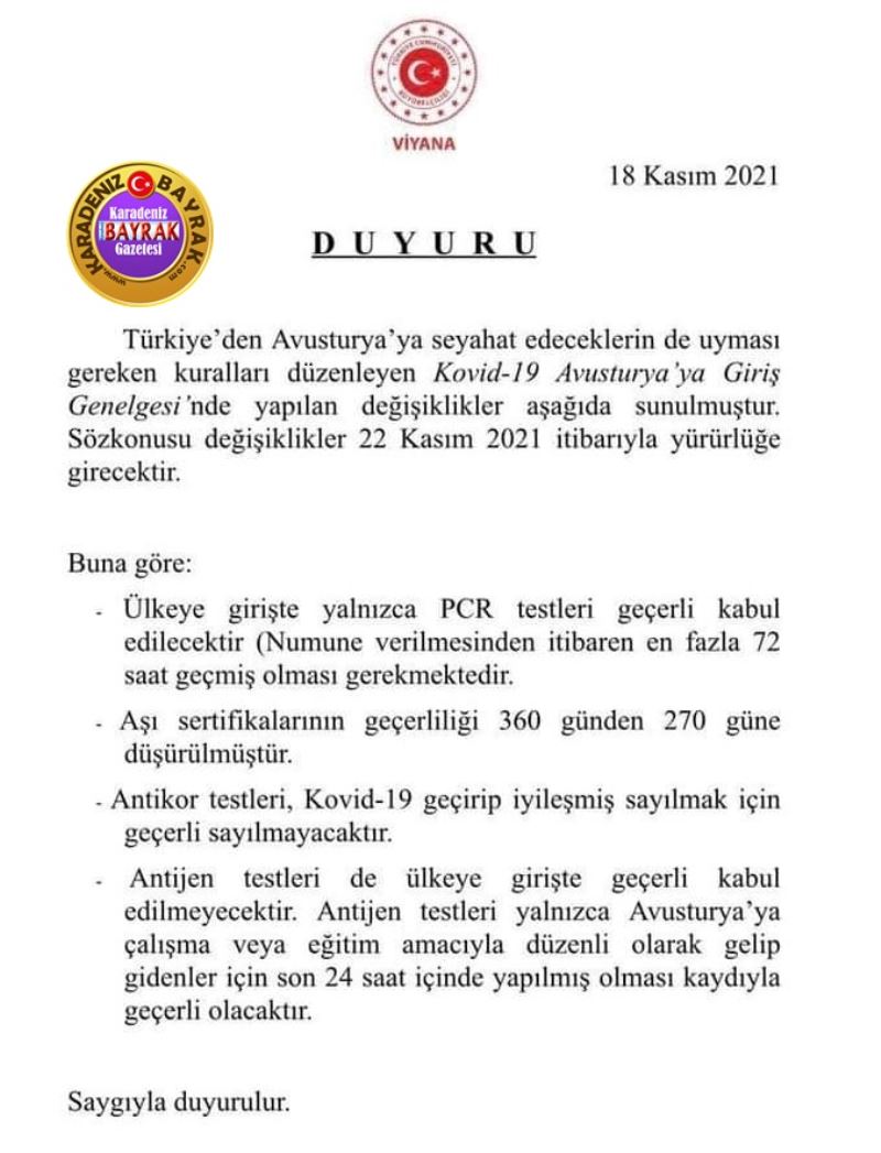 Avusturya'da 19Kasım 2021 tarihinde yapılan duyuruda 22 Kasım 2021 Pazartesi gününden geçerli olmak üzere 13.12. 2021 kadar sokağa çıkma yasağı geldi. Hastane, Banka, Postane, Market dışında her yer kapalı. Restoranlar sadece paket servis var yapacak.
