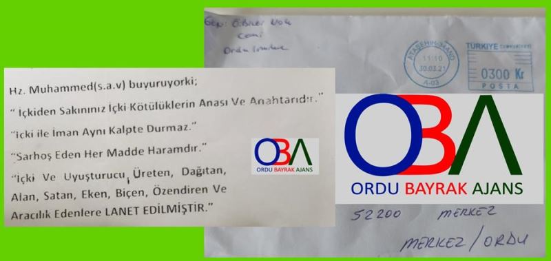 Türkiye genelinde olduğu gibi Orduda da sabah dükkânını açan bazı bayiler, kapı eşiğinde posta yolu ile gönderilen 'cami' imzalı veya isimsiz mektuplarla karşılaşıyor. 30.03,2021 tarihli mektubun gönderi adresinde Ordu yazarken postaya İstanbul Alaşehir'den verildiği görülüyor.