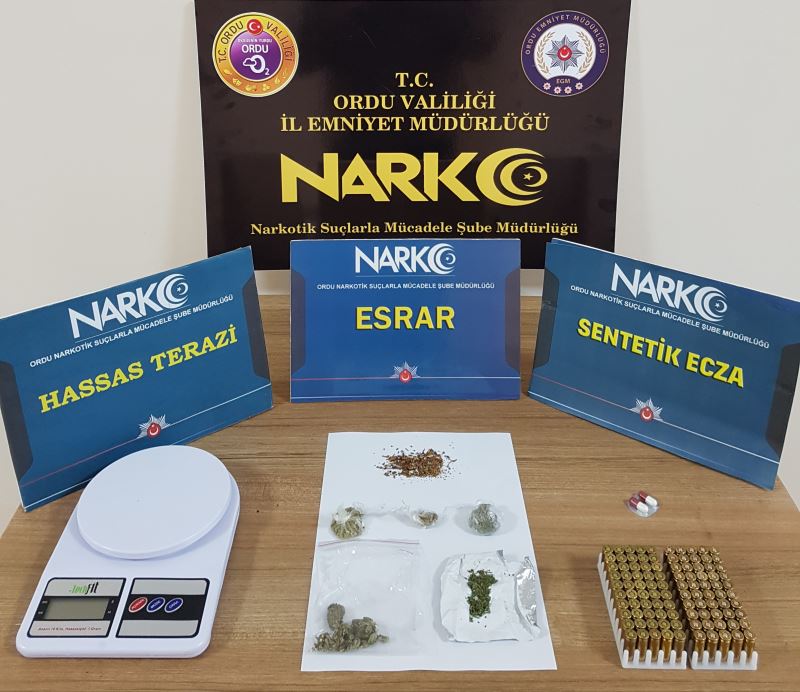 5 fişek halinde 5 gram Esrar maddesi, 2 adet Sentetik Ecza uyuşturucu hap, 100 adet 9x9 mm çapında tabanca fişeği, 1 adet hassas terazi ele geçirilmiş olup; 14 şüpheli hakkında uyuşturucu madde ticareti yapmak suçundan adli tahkikat başlatıldı.