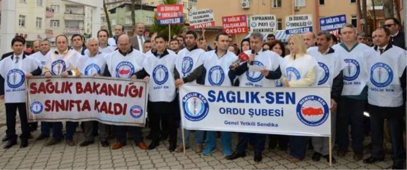 SAĞLIK SEN HAYAL KIRIKLIĞI YAŞIYORUZ-Sağlık-Sen Ordu Şube Başkanı Bilal İnanlı, sağlık çalışanlarının sorunlarına dikkat çekerek Sağlık Bakanlığı'na teki gösterdi. Sendika yönetici ve üyeleriyle Eğitim Araştırma Hastanesi önünde basın açıklaması yapan Bilal İnanlı şunları söyledi: 14 Mart Tıp Bayramı öncesi Sayın Başbakanımız tarafından sağlık çalışanlarına müjde şeklinde açıklanan hususlar ile ilgili Sağlık ve Sosyal Hizmet Çalışanlarının yetkili sendikası Sağlık Sen olarak aşağıdaki görüşlerimizi kamuoyu ile paylaşıyoruz: