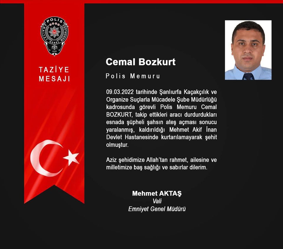 “09.03.2022 ÇARŞAMBA GÜNÜ ŞANLIURFA İLİ HALİLİYE İLÇESİ OSM HASTANESİ KAVŞAĞINDA GERÇEKLEŞEN SİLAHLI SALDIRI SONUCU GÖREVLİ KOMİSER YARDIMCISI ABDULLAH YASİR BİNİCİ VE POLİS MEMURU CEMAL BOZKURT ŞEHİT OLMUŞTUR. ŞEHİDLERİMİZ 10.03.2022 PERŞEMBE GÜNÜ SAAT: 09.00 DA İL EMNİYET MÜDÜRLÜĞÜ BAHÇESİNDE DÜZENLENECEK OLAN TÖREN SONRASINDA KOMİSER YARDIMCISI ABDULLAH YASİR BİNİCİ HAVAYOLU İLE İSTANBUL İLİNE POLİS MEMURU CEMAL BOZKURT KARAYOLU İLE GAZİANTEP İLİ KARKAMIŞ İLÇESİNE UĞURLANACAKTIR. ŞEHİDLERİMİZİN RUHU ŞAD MEKANI CENNET OLSUN. ŞANLIURFA VALİLİĞİ” ifadeleri yer aldı