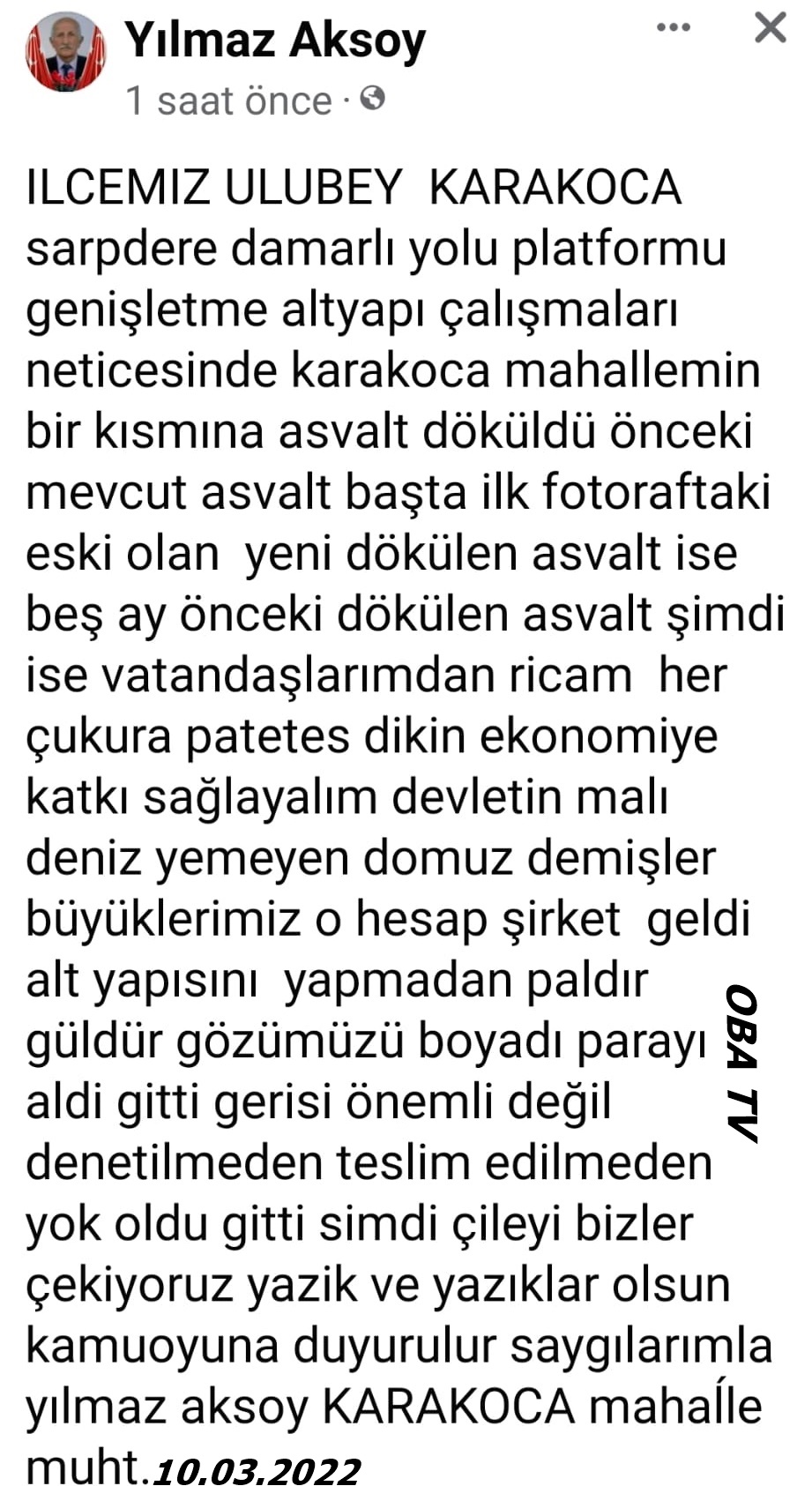 “İlçemiz Ulubey Karakoca Sarpdere Damarlı Yolu platformu genişletme altyapı çalışmaları neticesinde Karakoca mahallemin bir kısmına asfalt döküldü. Önceki mevcut asfalt başta ilk fotoğraftaki, eski olan yeni dökülen asfalt ise beş ay önceki dökülen asfalt. Vatandaşlarımdan ricam her çukura patates dikin. Ekonomiye katkı sağlayalım. Devletin malı deniz yemeyen domuz demişler büyüklerimiz. O hesap şirket geldi alt yapısını yapmadan paldır güldür gözümüzü boyadı, parayı aldı gitti. Gerisi önemli değil, denetilmeden teslim edilmeden yok oldu. Gitti, şimdi çileyi bizler çekiyoruz, yazık ve yazıklar olsun kamuoyuna duyurulur.”