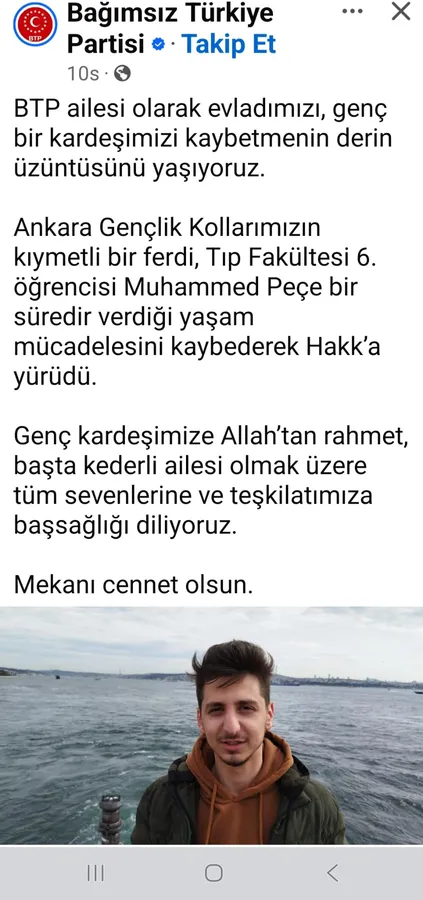 Bağımsız Türkiye Partisi (BTP) Rize İl Başkanı Hasan Peçe’nin oğlu, Ankara tıp fakültesi 5. sınıf öğrencisi Muhammet Peçe, yaşamını yitirdi.