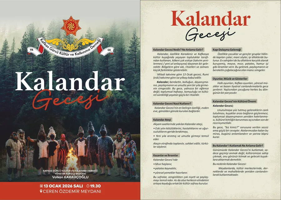 Kafkas Gürcü Kültür ve Kalkınma Derneği tarafından 13 Ocak Salı günü saat 19.30’da, Altınordu ilçesinde bulunan Ceren Özdemir Meydanı’nda Kalandar Gecesi Kutlaması düzenlenecek.