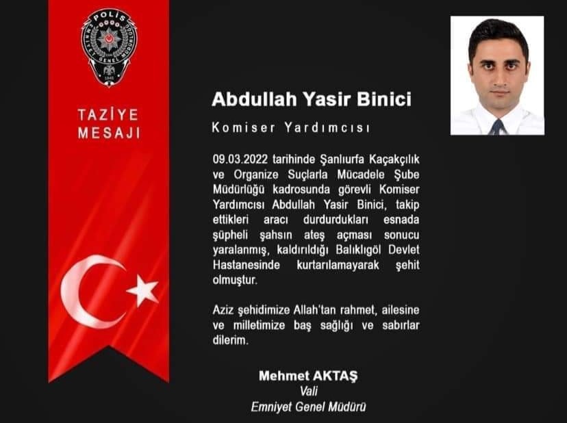 “09.03.2022 ÇARŞAMBA GÜNÜ ŞANLIURFA İLİ HALİLİYE İLÇESİ OSM HASTANESİ KAVŞAĞINDA GERÇEKLEŞEN SİLAHLI SALDIRI SONUCU GÖREVLİ KOMİSER YARDIMCISI ABDULLAH YASİR BİNİCİ VE POLİS MEMURU CEMAL BOZKURT ŞEHİT OLMUŞTUR. ŞEHİDLERİMİZ 10.03.2022 PERŞEMBE GÜNÜ SAAT: 09.00 DA İL EMNİYET MÜDÜRLÜĞÜ BAHÇESİNDE DÜZENLENECEK OLAN TÖREN SONRASINDA KOMİSER YARDIMCISI ABDULLAH YASİR BİNİCİ HAVAYOLU İLE İSTANBUL İLİNE POLİS MEMURU CEMAL BOZKURT KARAYOLU İLE GAZİANTEP İLİ KARKAMIŞ İLÇESİNE UĞURLANACAKTIR. ŞEHİDLERİMİZİN RUHU ŞAD MEKANI CENNET OLSUN. ŞANLIURFA VALİLİĞİ” ifadeleri yer aldı